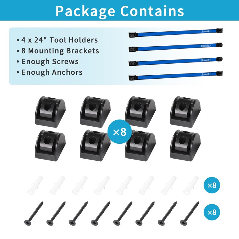 - MAGNETIC TOOL HOLDER SET: Rechabite magnet tool organizer set includes 4 pieces 24" magnetic tool bars, comes with 8 mounting brackets, screws and anchors. Each magnetic tool strip is extendable with each other connected.
