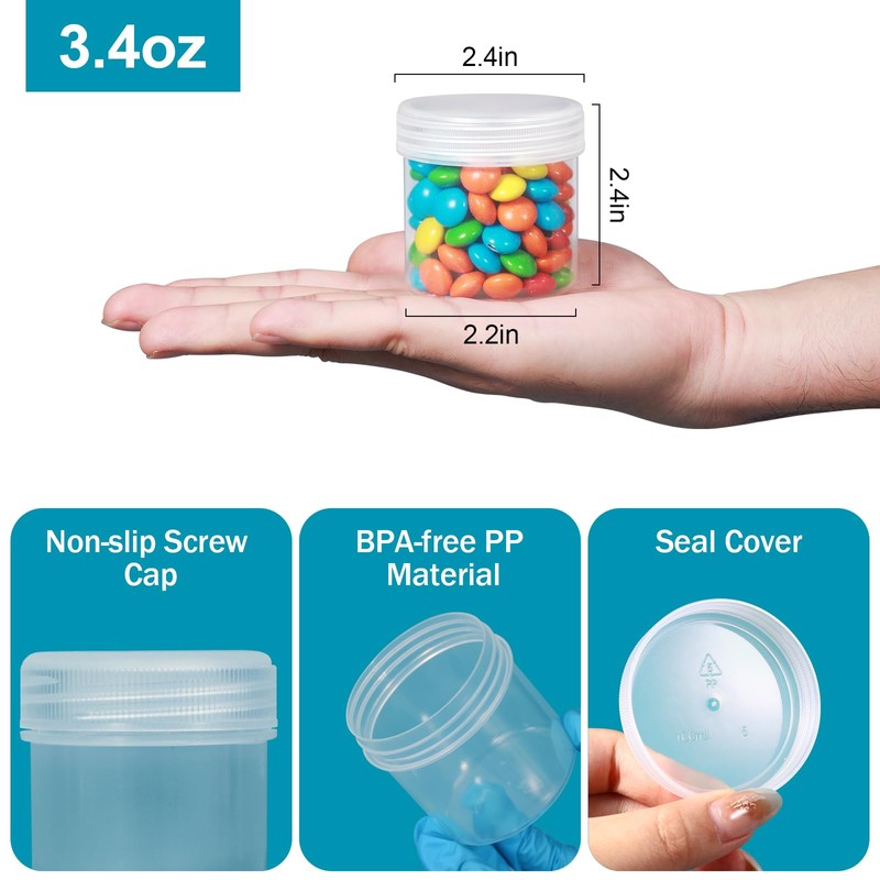 - Fácil de usar: el diseño de boca ancha de estos frascos de plástico hace que sean fáciles de llenar y acceder, acomodando varios artículos. También simplifica la limpieza, lo que permite una fácil reutilización, reduciendo los residuos. El color transparente te permite identificar claramente el contenido