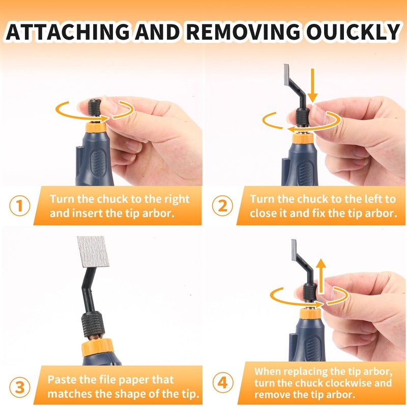 - 【5 Types of File Paper & 6 Types of Tips】In addition to No.180, No.240, and No.400 in the regular set, No.800 and No.1000 file paper are included. This enables even finer finishing work. There are 6 types of tip arbors that can be replaced with a single touch. Each sheet of file paper contains 6 different shapes to match the tip arbor. The back side is a sticker, so it can be attached to the tip arbor as it is.