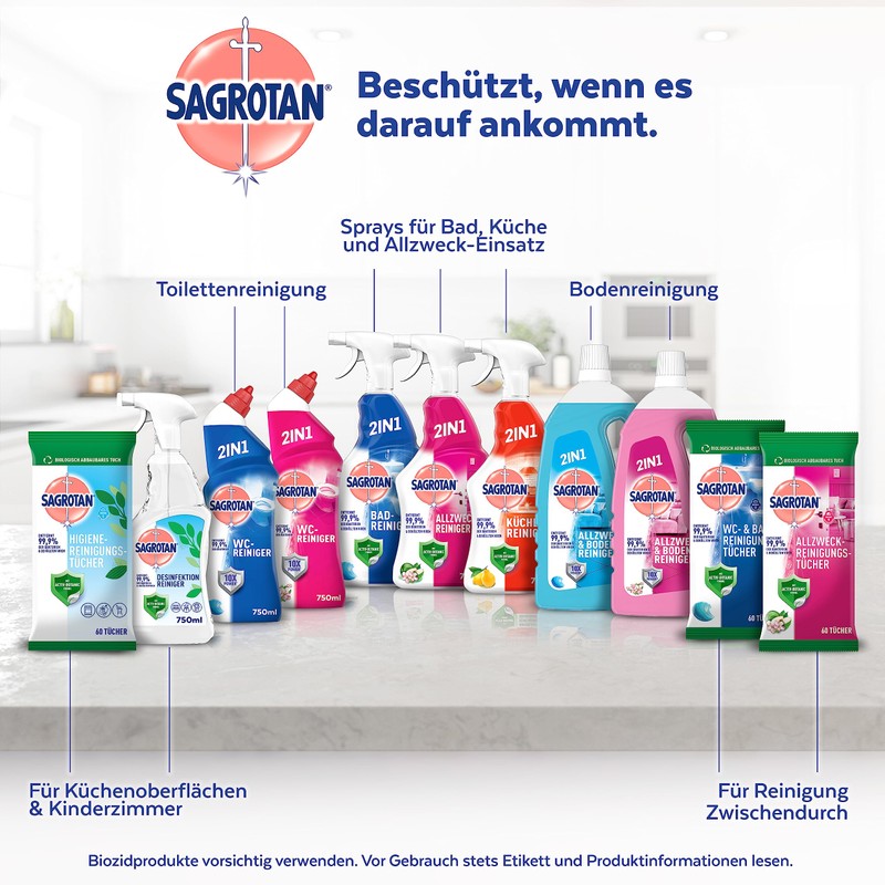 - Seit 110 Jahren sorgt Sagrotan für hygienische Sauberkeit zuhause / Biozidprodukte vorsichtig verwenden und vor Gebrauch stets Etikett und Produktinformationen lesen. BAuA Reg: N-81551
