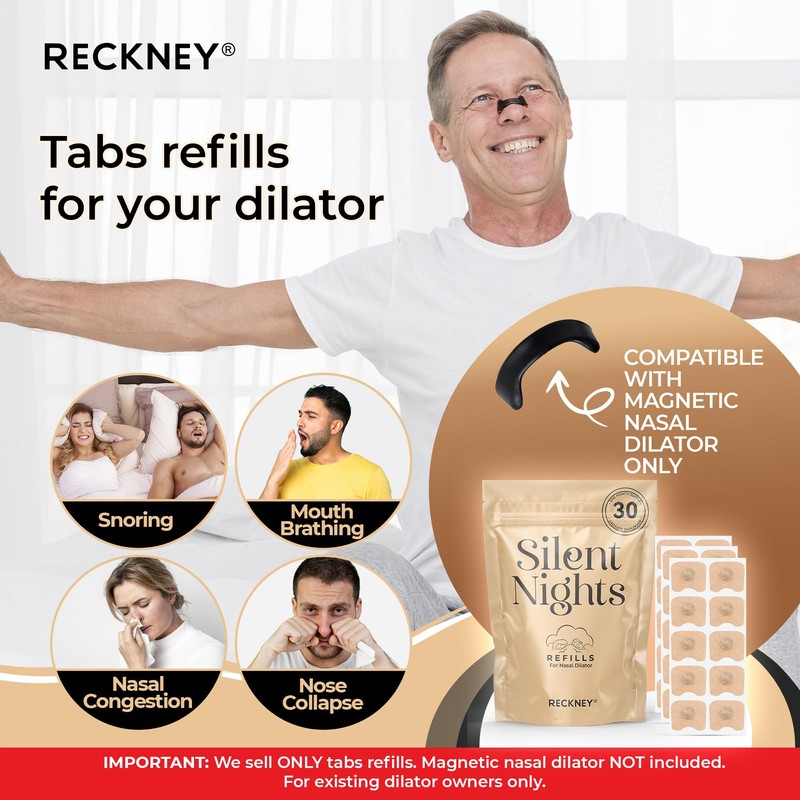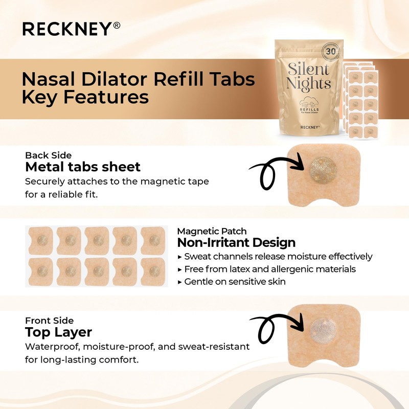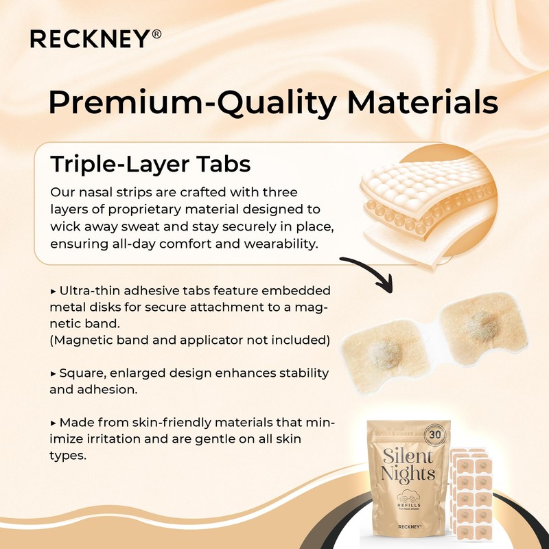 Discover the innovation of RECKNEY Tabs - advanced magnetic nose stickers engineered for reliable breathing support. These premium tabs feature a unique three-layer construction using 100% medical-grade materials, delivering exceptional sweat-wicking properties and all-day adhesion. Each tab combines a metal disk that attaches to the magnetic band, a waterproof barrier that repels moisture, and a specially designed sweat channel for comfort. The latex-free, hypoallergenic design ensures they're gentle on sensitive skin while maintaining a secure fit during sleep or physical activity. Application is straightforward with three simple steps: pop out a tab, use the applicator to remove backing, and place on either side of your nose. The tabs boast an impressive 5-year shelf life from manufacture date, making bulk purchases practical. Perfect for those seeking a dependable solution for improved breathing, these tabs offer consistent support with every use. Each component is thoughtfully designed for maximum effectiveness and comfort, setting a new standard in breathing assistance technology.