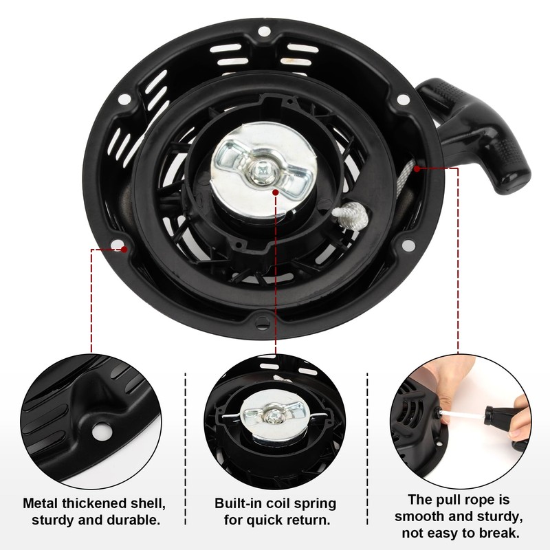 • 【Superior Performance】 Constructed with a combination of premium plastic and metal materials, the recoil starter is both sturdy and durable. The pull rope is smooth and designed to resist breaking, while the handle is easy to disassemble and offers a comfortable grip. The product features a built-in coil spring that allows for quick return, enhancing its overall performance and reliability.