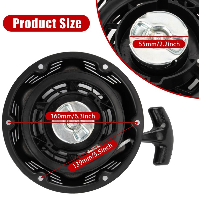 • 【Specifications】 The recoil pull starter features a ratchet diameter of 2.16 inches and a plastic housing diameter of 2.95 inches. The iron housing has a diameter of 6.29 inches (crossing the center point), and the mounting hole distance (adjacent) is 5.47 inches. The mounting hole inner diameter is 0.15 inches. These dimensions ensure a precise fit and easy installation on compatible equipment.