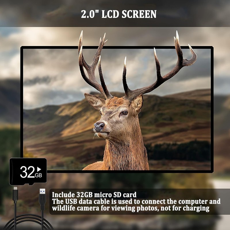 - 【EASY TO SETUP, EASY TO VIEW】The night camera wildlife is easy to set up and secure in place with the included mounting strap and threaded tripod. ①View images or videos directly on your hunting camera. ② Use the included USB data cable to connect trail cam and computer for viewing. ③Use the card reader not included. (⚠Does not include 8 AA batteries or 6V 1.5A external power supply)