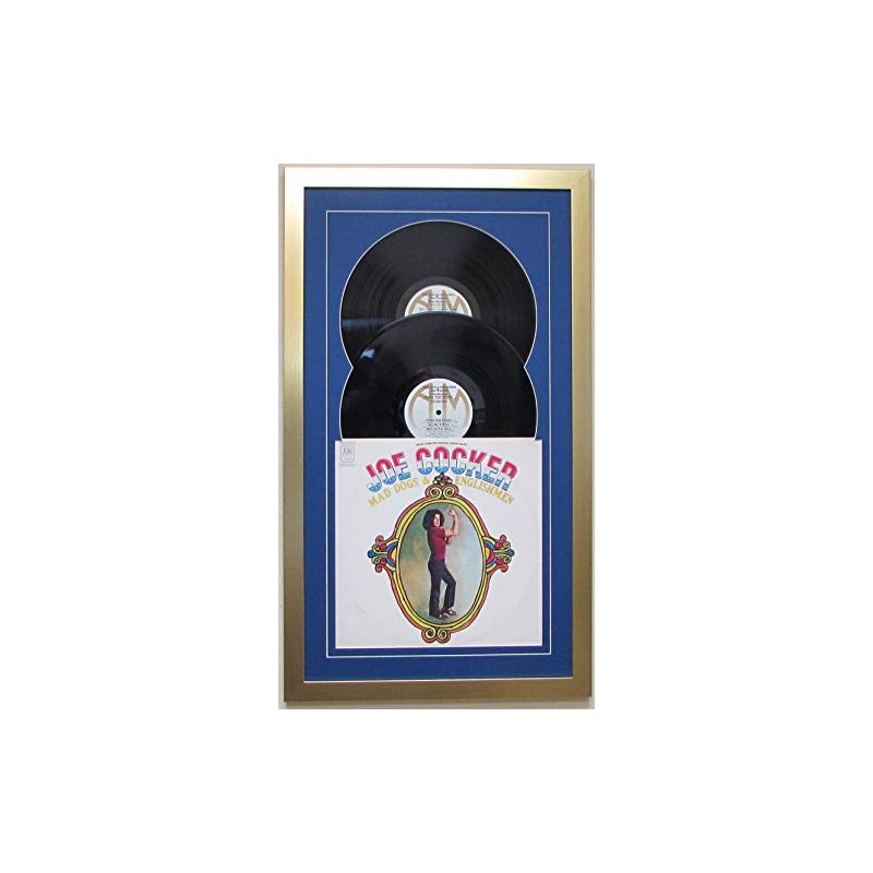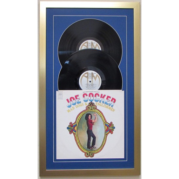 Record Album Double Vinyl LP Frame Display Featuring Dark Blue Matting Juke Box Style Design (Gold Frame)