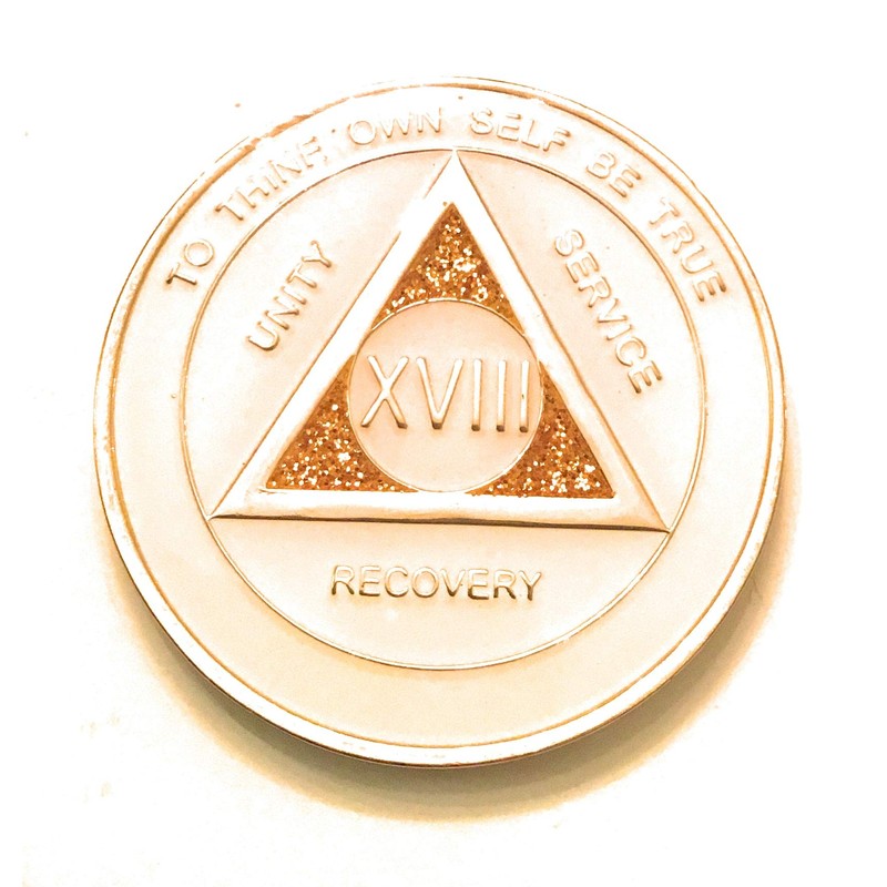 Recovery Line 18 Year AA Medallion - Alcoholics Anonymous- White & Gold, Bling, Glitter, Sobriety, Chip, Token, Coin