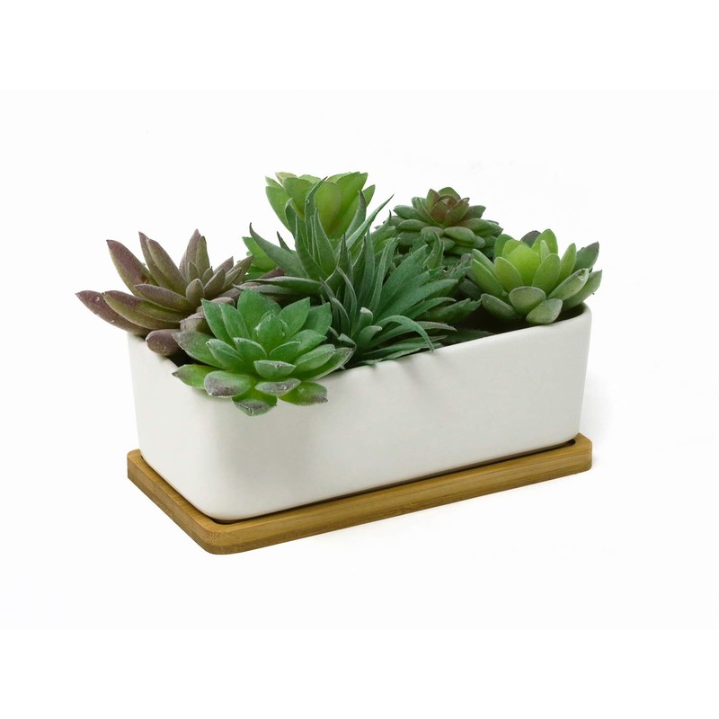 Rectangular Long White Ceramic Succulent Planter Pot with Drainage Hole and Bamboo Saucer