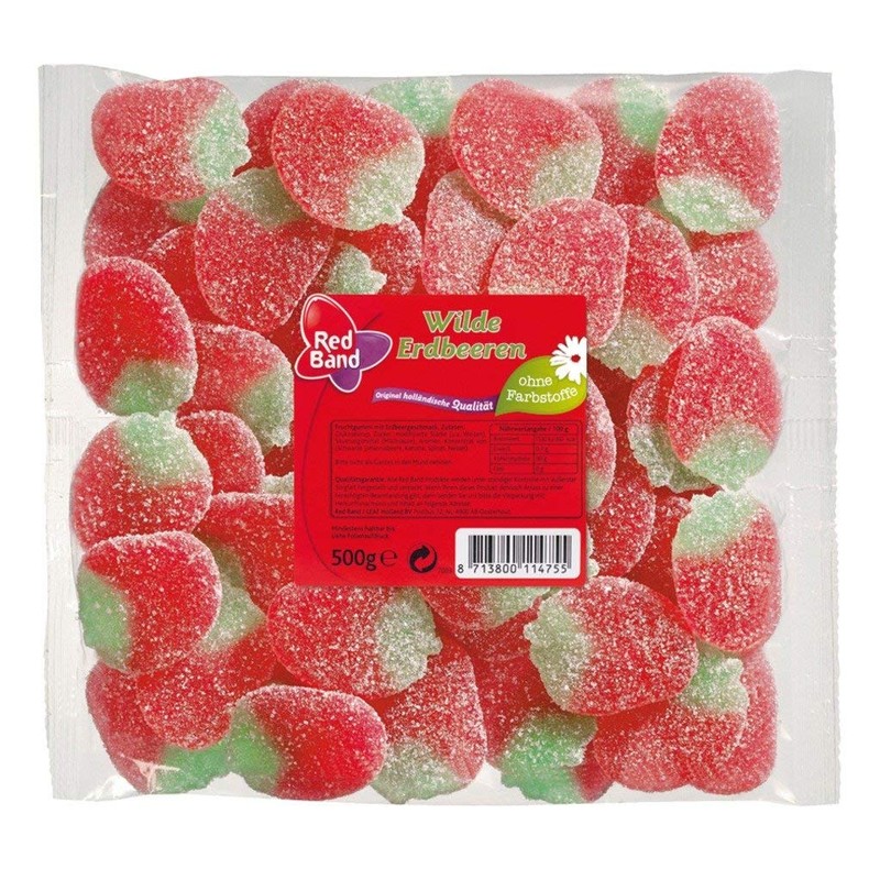 Name of the food: Red Band Wild Strawberries - Fruit gum with strawberry flavour.