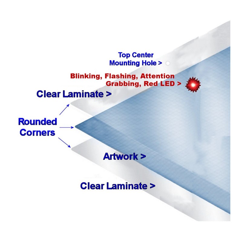 features flashing red LED, robust 20 mil lamination (10 mil lamination per side). Pre-punched mounting hole at the top center of the sign. Additional holes may be added as needed using a hammer and nail depending upon the mounting application.