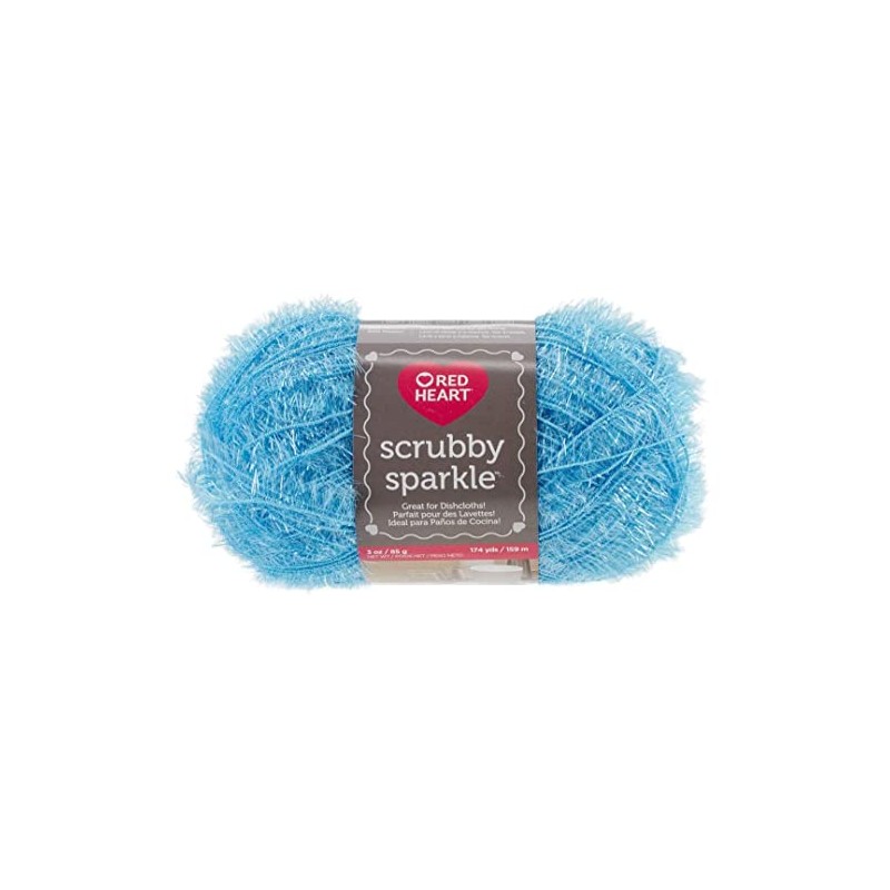 - Red Heart-Scrubby Sparkle Yarn. A uniquely textured yarn with a sparkle effect great for making pan scrubbies but also great for making crafty items. Weight category: 4. Content: 100% polyester. Put-up: 3oz/85g, 174yds/159m. Gauge: 18sX24r = 4in/10cm on size US8/5mm knitting needles. Crochet: 14scX13r = 4in/10cm with size I-9/5. 5mm crochet hook. Dyelotted: we try but are not always able to match dye lots. Care: machine was cold gently cycle, tumble dry, do not bleach or iron, dry clean with P solvents only. Comes in a variety of colors. Each sold separately. Imported