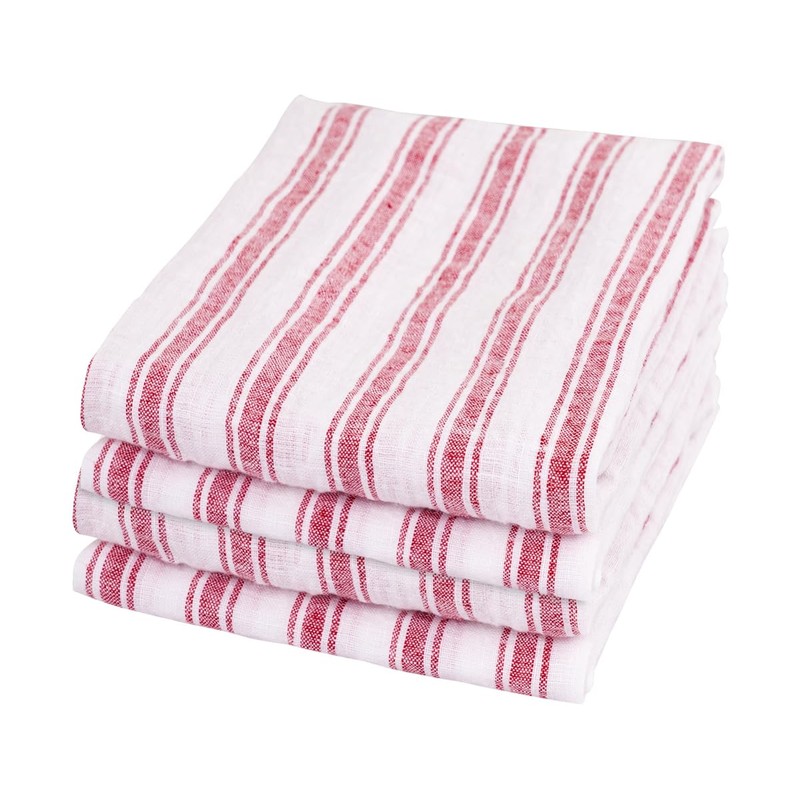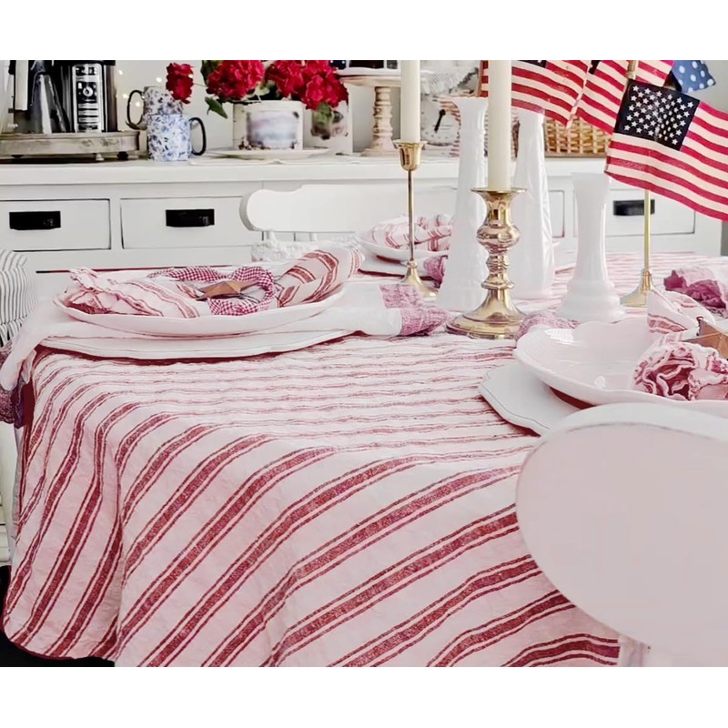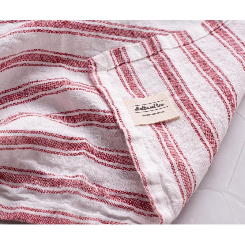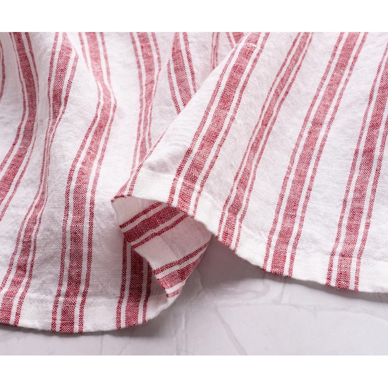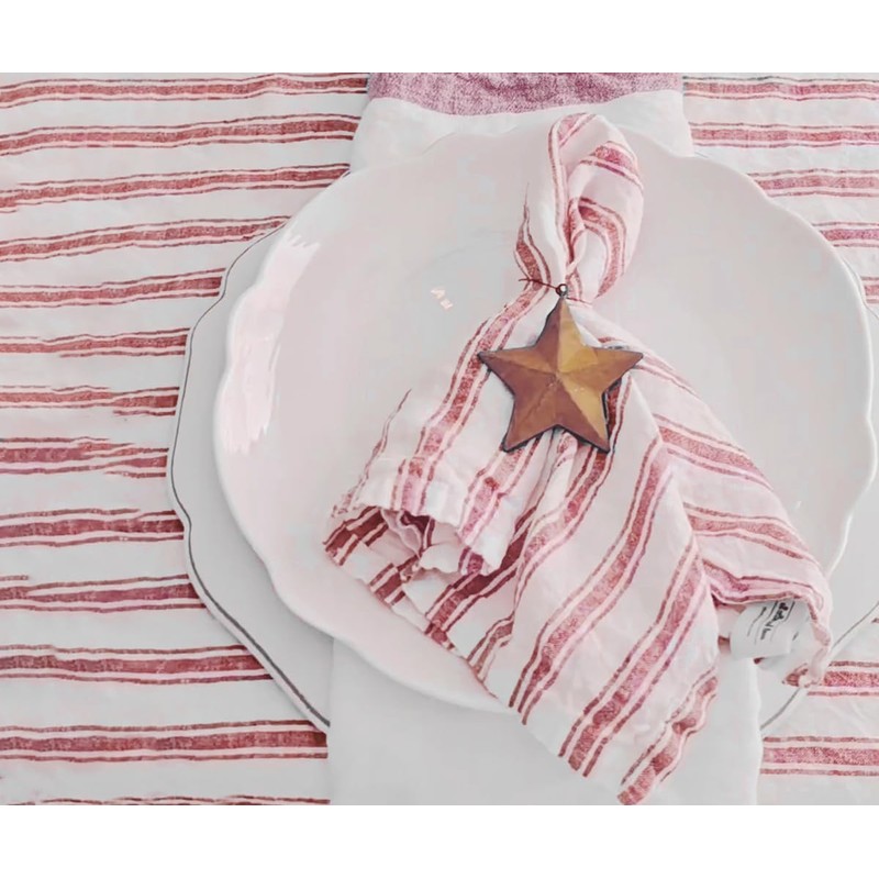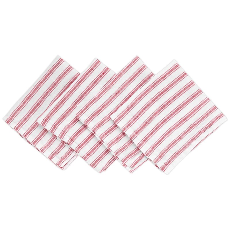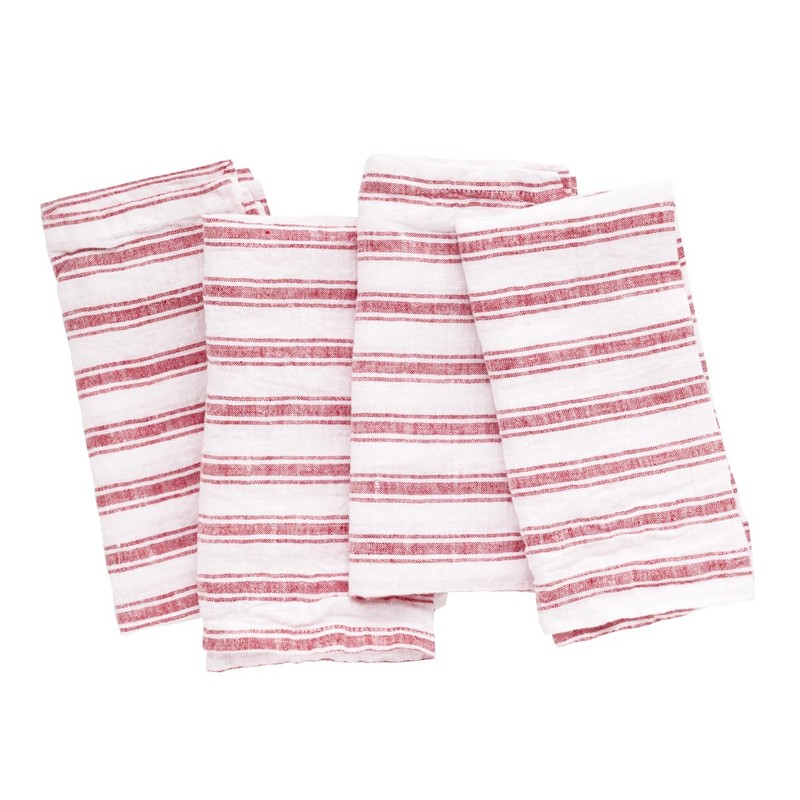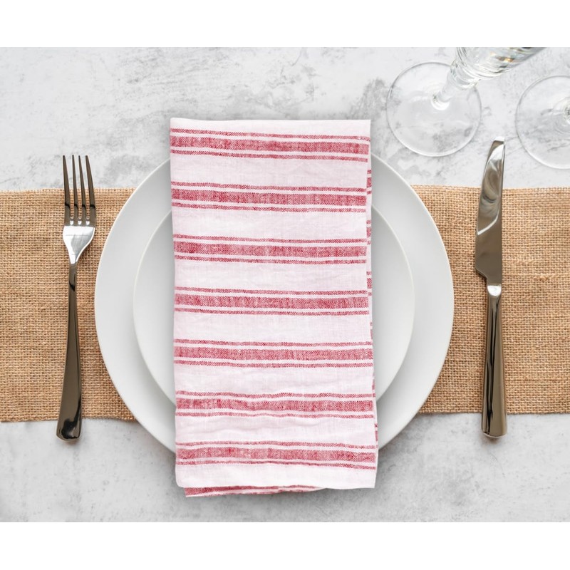 - Linen Dinner Napkins: Farmhouse striped napkins look good on all occasions and are the most practical option. Red linen napkins are an innovative and sustainable alternative to paper napkins and tissues. The pure white color instantly enhances your tabletop, and linen-striped napkins make it look simple yet elegant.
