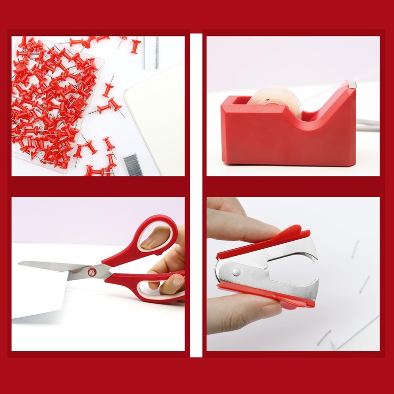 - 【Package Includes】This red office supplies contains 1x 6.1inch Stapler, 1x Staple Remover, 1000x Staples, 1x Tape Dispenser, 1x Office Scissor, 1 box of 100 Push pins and 10 colors Tabs with ruler. Such a complete red desk accessories combination is enough to meet your school and office using needs.
