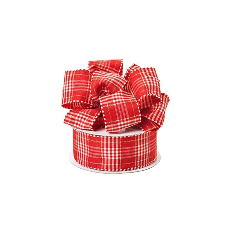 - This red plaid ribbon has white and gold stripes, creating a traditional Tartan Plaid design. This 1-1/2" wide ribbon comes on a large 25 yard roll.