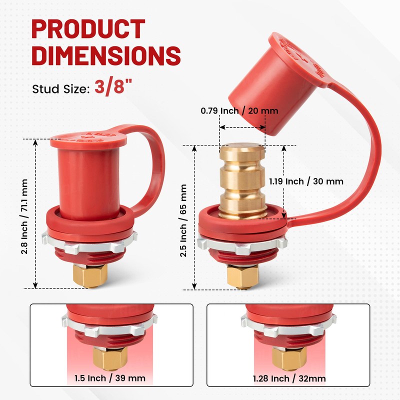 - Convenient to Install: Battery terminal is compactly designed to be mounted on panels up to 0.3 inches thick through 1-1/4 inch holes; The 3/8-inch brass terminals on the other side can accommodate the largest battery cable lugs