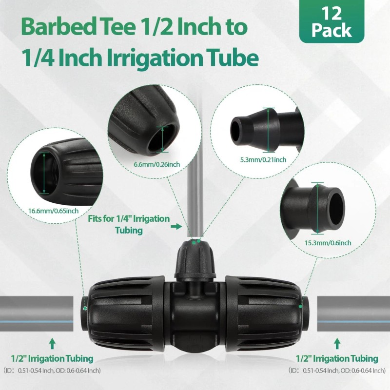 Our 12-piece barbed tee 1/2 inch (1/2" ID x0.6-0.65" OD) to 1/4 inch irrigation tube let you connect your irrigation systems as you wish. Designed for seamless integration into your irrigation system, these 1/2 to 1/4 fittings provide a reliable solution for connecting 1/2 inch main tubing to 1/4 inch drip tubing. Enjoy a seamless installation experience—no tools required! Simply push the tubing onto the barb and secure it with a nut for a tight, leak-proof connection. Crafted from high-quality hard plastic, these 1/2 inch to 1/4 inch irrigation reducers are built to withstand pressure, resist aging, and endure UV exposure, ensuring a long service life. Versatile and adaptable, our drip system 1/2" to 1/4" reducer are perfect for diverse applications, including gardens, greenhouses, patio vegetable gardens, flower beds, terraces, and lawns.