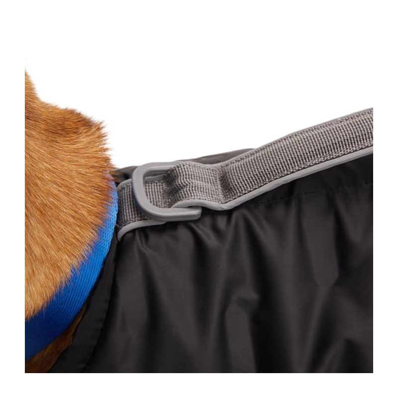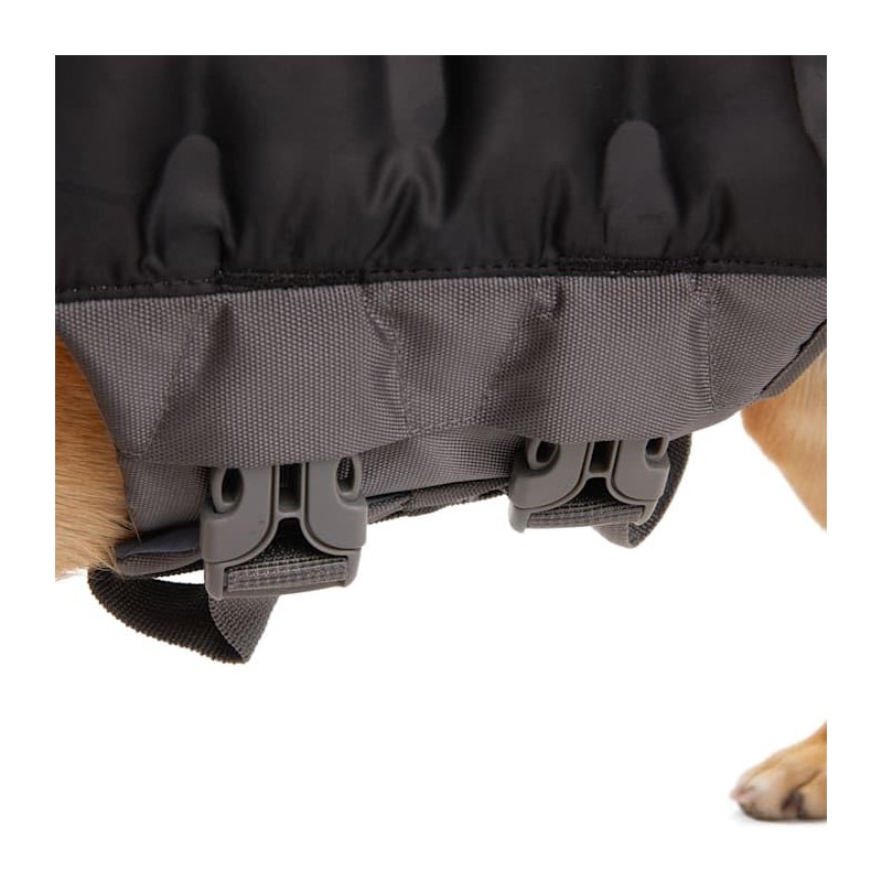 - Several points of adjustability and points of closures for secure fit: plastic clip buckle closures at belly and a plastic clip buckle closure at neck with additional hook and loop closures