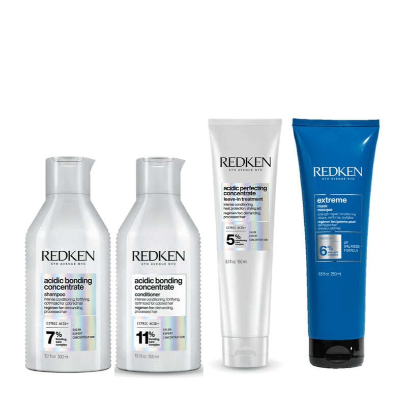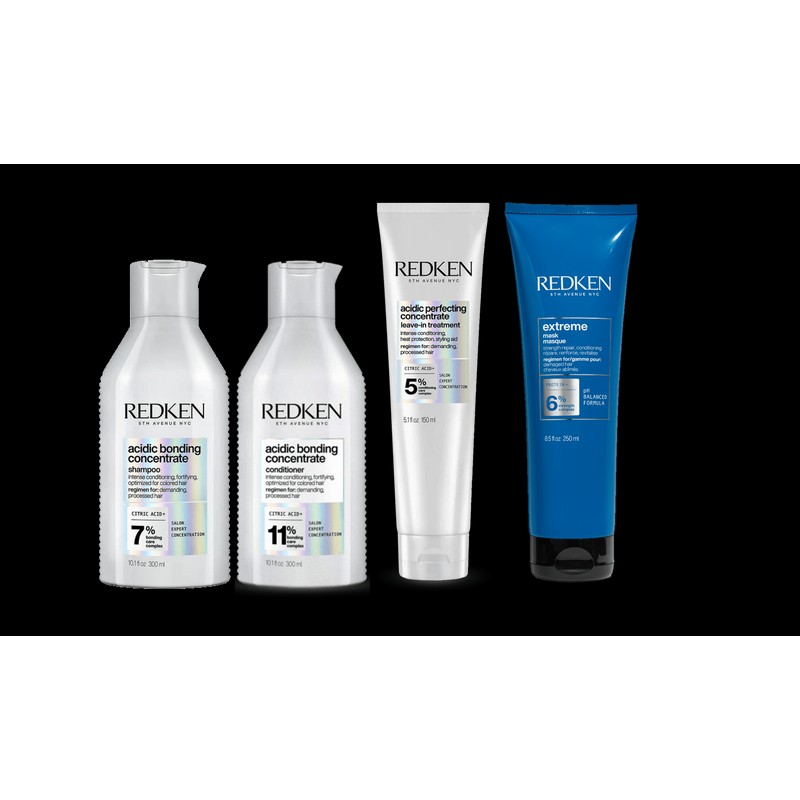 Redken is one of Australia's most trusted brands of hair products, offering a wide range of haircare products designed to treat damaged and frizzy hair to return it to its full potential. The Bonding Obsessed Bundle includes the Acidic Bonding Concentrate Shampoo, Acidic Bonding Concentrate Conditioner, Acidic Bonding Concentrate Leave-In Treatment, and Extreme Mask, all formulated to provide ultimate strength repair, intense conditioning, and hair color fade protection.