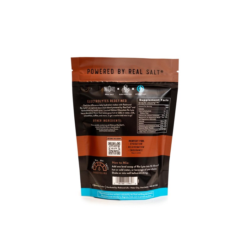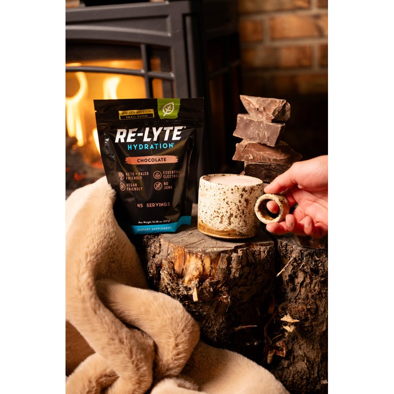 - CHOCOLATE- Indulgent and comforting, Limited Edition Chocolate Re-Lyte Hydration delivers the rich, smooth taste of chocolate with the added hydration benefits of Real Salt. Perfect for cozying up on cold days, this flavor captures the warmth of winter nights and fireside relaxation, leaving you hydrated, satisfied, and ready to savor every comforting moment. Chocolate Re-Lyte tastes great hot or cold, in water, milk, smoothies, coffee, and more, so get creative and mix it up!