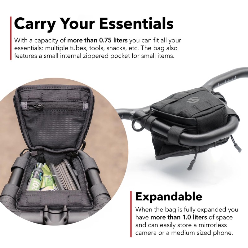 - CARRY YOUR ESSENTIALS – With a capacity of more than 0.75 liters you can fit all your essentials: multiple tubes, tools, snacks, etc. When the bag is fully expanded you have more than 1.0 liters of space and can easily store a mirrorless camera or a medium sized phone. The bag also features a small internal zippered pocket for small items.