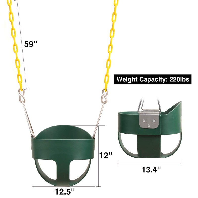 - PREMIUM QUALITY: The High Back Full Bucket Toddler Swing Seat is constructed with durable plastic and heavy duty components. New and improved with updated STAINLESS STEEL hardware with plastic coated chain!