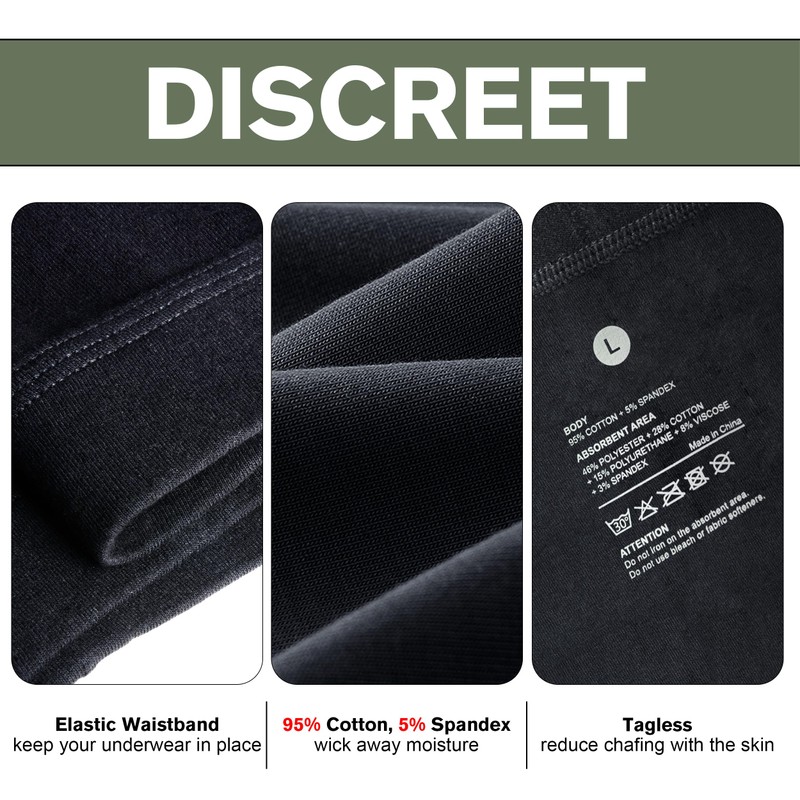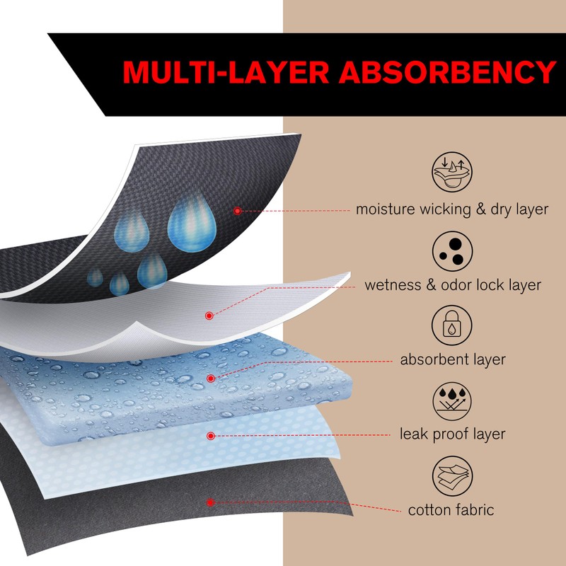 - MULTILAYER ABSORBENCY: This boxer brief features a multi-layer absorbent construction design. The absorbent layer quickly absorbs liquids and locks in to prevent leakage. The leak-proof layer effectively prevents bladder leakage and provides all-day protection
