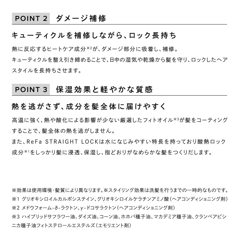 - Straight Lock [Corrects the ribbing and locks straight. Straight hair with the power of acid heat: You can easily use the swelling care "Acid Heat Treatment" in your own home. ReFa STRAIGHT LOCK is a unique blend of acid heat lock ingredients *1 and heat care ingredients *2 to reduce damage while maintaining a wrinkled and wavy hair and applying heat of a straight iron to achieve a straighter and natural straight hair. For everyday hair with good fingers, straight hair. 1 Glyoxyloyl Carbotiine, Glyoxyloil Keratin Amino Acid (Hair Conditioning Agent) *2 Meadow Foam -Racton, Gi -Docosalacton (Hair Conditioning Agent)