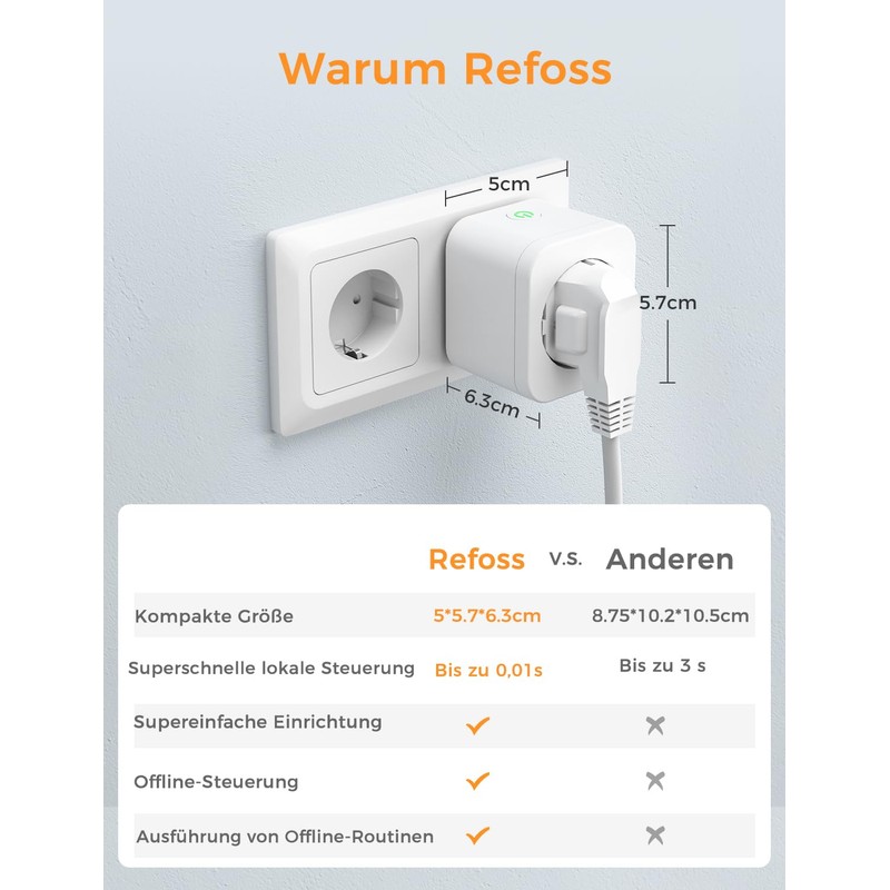 - Power meter for socket: Refoss intelligent socket allows real-time monitoring of the power consumption of your household appliances. With the Refoss app, you have a clear overview of daily, weekly, monthly and annual consumption. (By entering the cost factor per kilowatt hour, the total amount of the electricity bill can be calculated.) In addition, the socket can also monitor the energy generation of your balcony power plant.