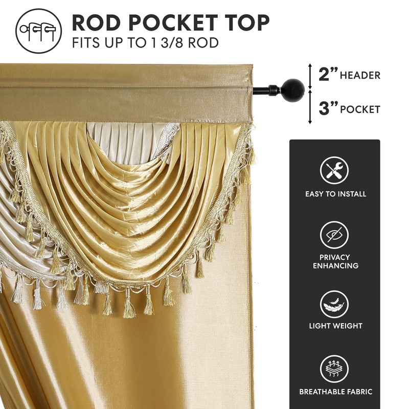 - Elevate Your Living Room, Dining Room, or Bedroom With This Soft Window Treatment: Elegant gold curtains feature solid curtain panels, attached waterfall valance in a two-tone design with tasseled ends, and matching tie backs