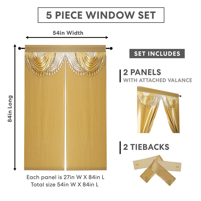Regal Home Collections Amore Curtains 5-Piece Window Curtain Set - 54-Inch W x 84-Inch L Panels with Attached Valance and 2 Tiebacks - Bedroom Curtains and Living Room Curtains (Gold)