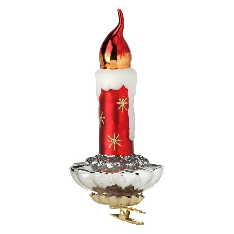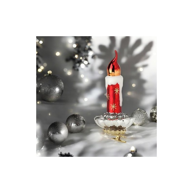 - Vintage Design: This 6.5" Glass Retro Candle Ornament features a red candle with glittering gold stars and a realistic flame tip, adding a touch of nostalgia to your holiday decor.