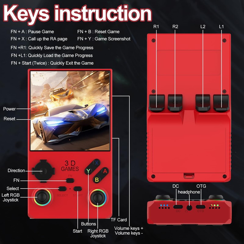 - Dual colorful RGB lighting joystickThis retro handheld game console comes with two 360-degree joysticks and colorful RGB backlight, allowing you to enjoy smooth game operation and stunning visual effects.