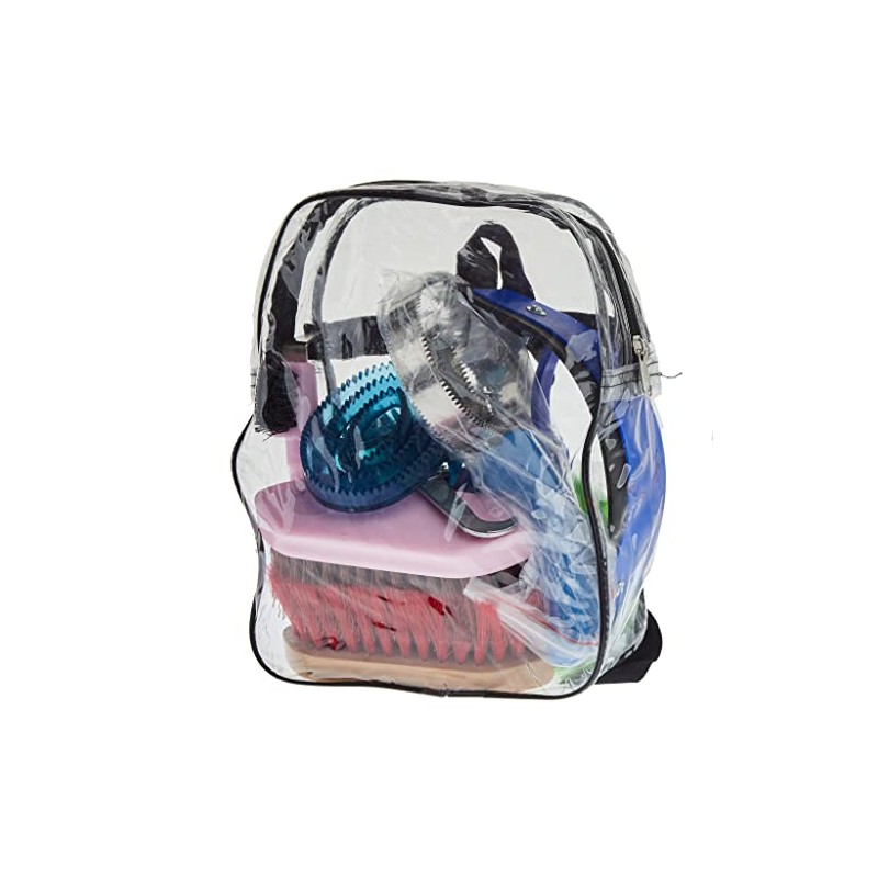 - Includes: Clear back pack, hard and soft thistle grooming brushes, hoof pick, water scraper, curry combs, and mane and tail combs.