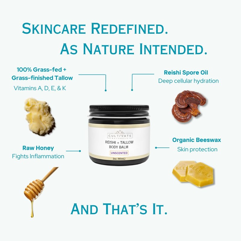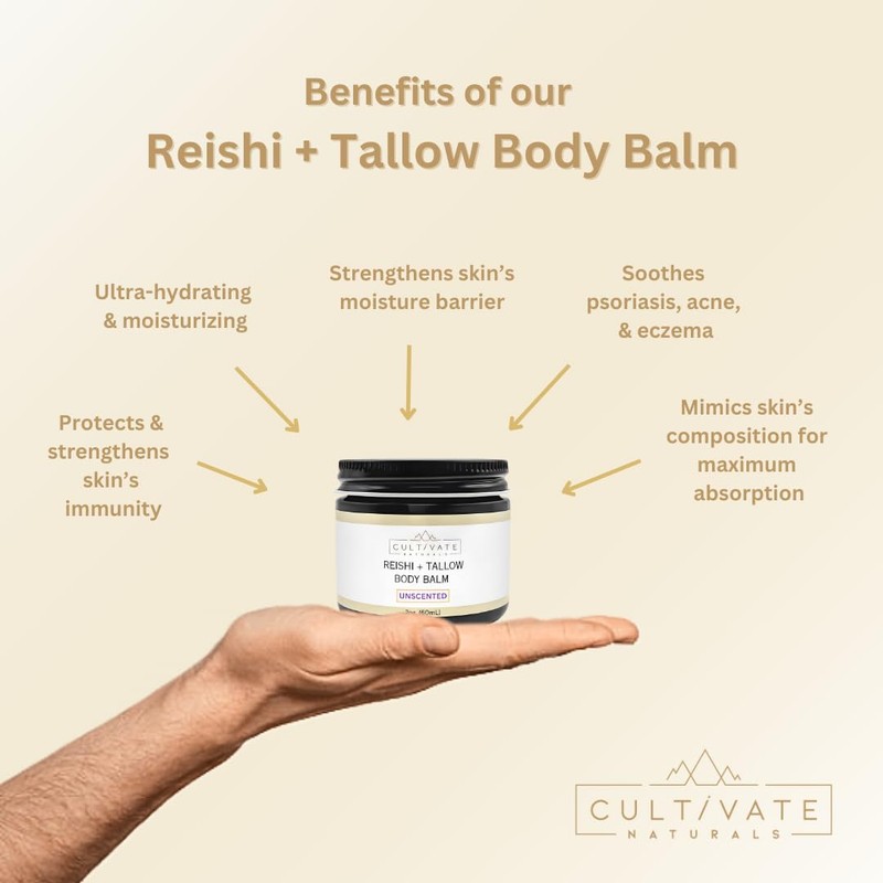 Reishi Tallow Body Balm - Unscented (2 oz) | Grass Fed Beef Tallow - Non-toxic, Organic, Paleo Friendly Skincare | Infused with Reishi Spore Extract | Moisturizing & Hydrating for Sensitive Skin