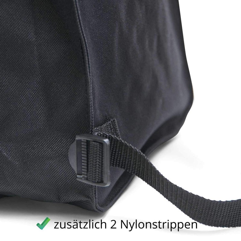 Saddle bag double pannier bag saddle pack bag made of water-repellent, robust nylon fabric. The pack bag has a carabiner on the top left and right. The side pockets can be closed with 2 nylon straps. In addition, 2 nylon strips at the bottom of the saddle bag to attach it to the saddle with the straps. The saddle bag offers enough space to safely store all the essentials for a day trip or hiking trip. Dimensions of the bags: length: 30 cm, width: 24 cm, depth: 10 cm, total length of double pannier: 110 cm, colour: black, material: nylon/Cordura 01304D