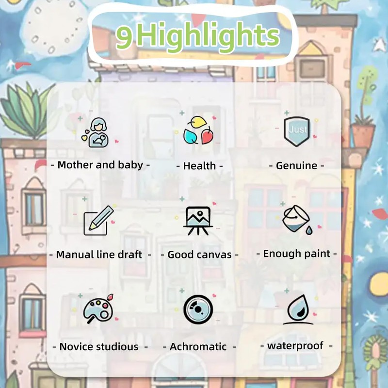 The kit includes 1 waterproof canvas, 1 instruction sheet and line drawing, 1 set of acrylic paints, 3 paintbrushes, 1 set of hooks. The canvas is marked with numbers that correspond to the colors of paint that should be applied in those areas, making the painting process straightforward and convenient.