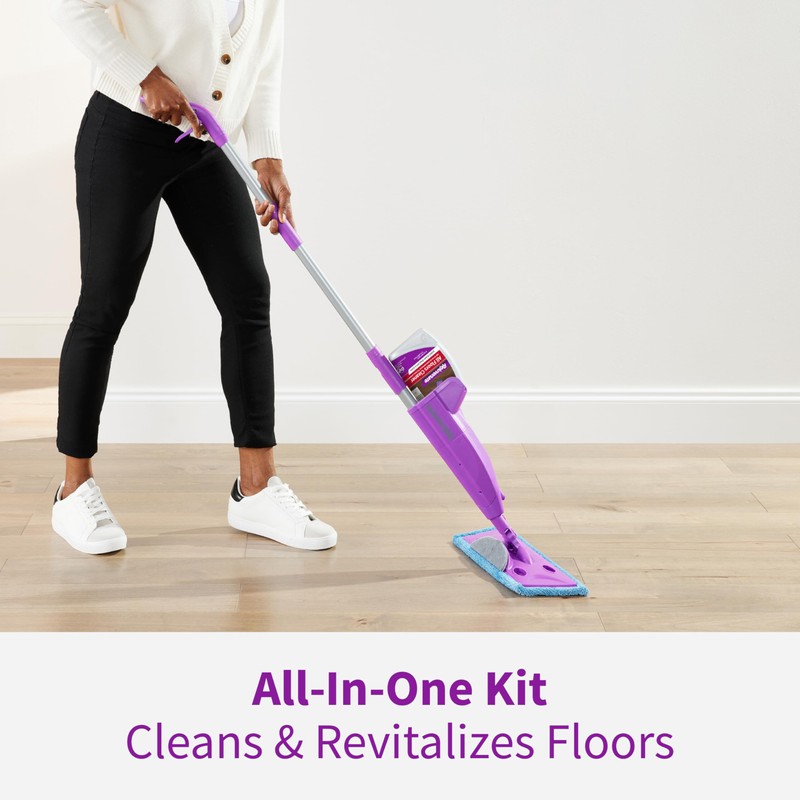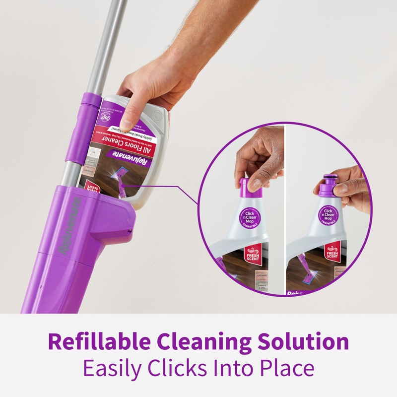 Rejuvenate? Click n Clean? Multi-Surface Spray Mop System has everything you need to eliminate dirt and grime and give your floors a brilliant clean. This all-in-one kit includes a durable mop with an extra-large pivoting head and three reusable microfiber pads. With refillable cleaning solutions that easily click into place, this versatile mop system can be used with any 32 oz or 40 oz Rejuvenate? cleaner, including All Floors Cleaner, Luxury Vinyl Floor Cleaner, Wood Floor Cleaner, Stone, Tile & Laminate Cleaner and Tile & Grout Floor Cleaner. The extra-wide mop head swivels to clean hard-to-reach places and the heavy-duty scrub pad tackles stuck-on messes. Plus, the reusable microfiber cleaning pads are washable up to 100X, giving you an economical way to keep your floors looking great. Always test on an inconspicuous area before using. Spray Rejuvenate? All Floors Cleaner on the floor and mop with the grain. Allow the floor to dry completely before walking. NOTE: Only use when temperatures are above 50 degrees Fahrenheit. Do not oversaturate.