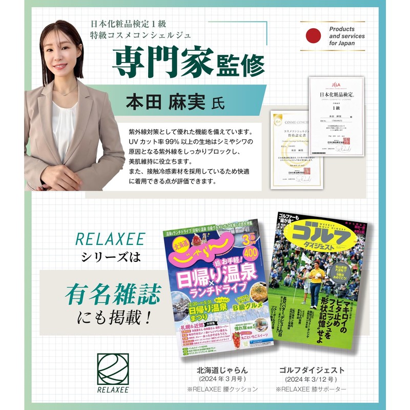 - (Thorough Quality Control) RELAXEE UV arm covers are manufactured in an ISO 9001 certified factory. In order to ensure that our customers use our products with confidence, they are manufactured and inspected under thorough quality control