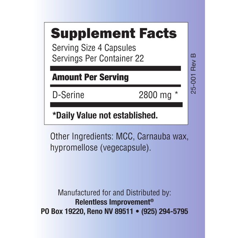 D-Serine is an amino acid found in the brain. Supports healthy cognition and mood. Directions: As a dietary supplement, take 3 to 4 capsules daily, dependent upon body weight, or as recommended by a health care professional. Additional benefits may be found in some people with dose of 6-8 capsules per day.