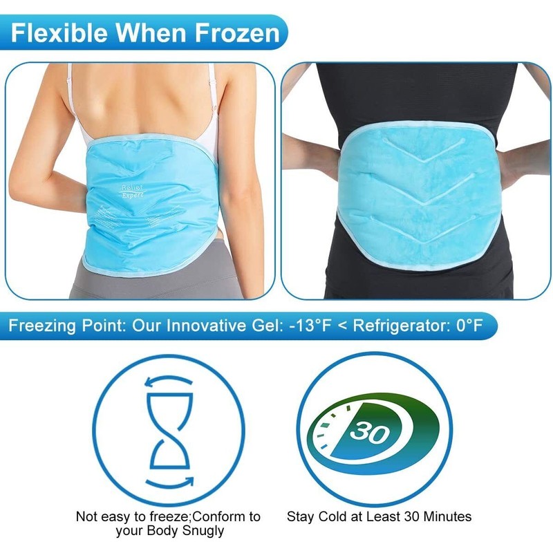 - Use Directly & Innovative Two Sided Design - The Relief Expert ice packs for back injuries reusable can use straight to skin, unlike other back ice pack need to put in wrap to use. Our gel ice pack adopts innovative two sided design. One side is soft plush lining, use directly to skin removing a fear of frostbite, stay cold without condensation. If you need cold therapy once the plush side is not cold enough, then flip over to use nylon side, penetrating stronger coldness to relieve back pain.