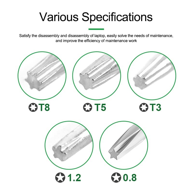 - HEAD TYPES - This screwdriver set includes Pentalobe P2 0.8mm, Pentalobe 1.2mm, a Torx T3, Torx T5 and a Torx T8