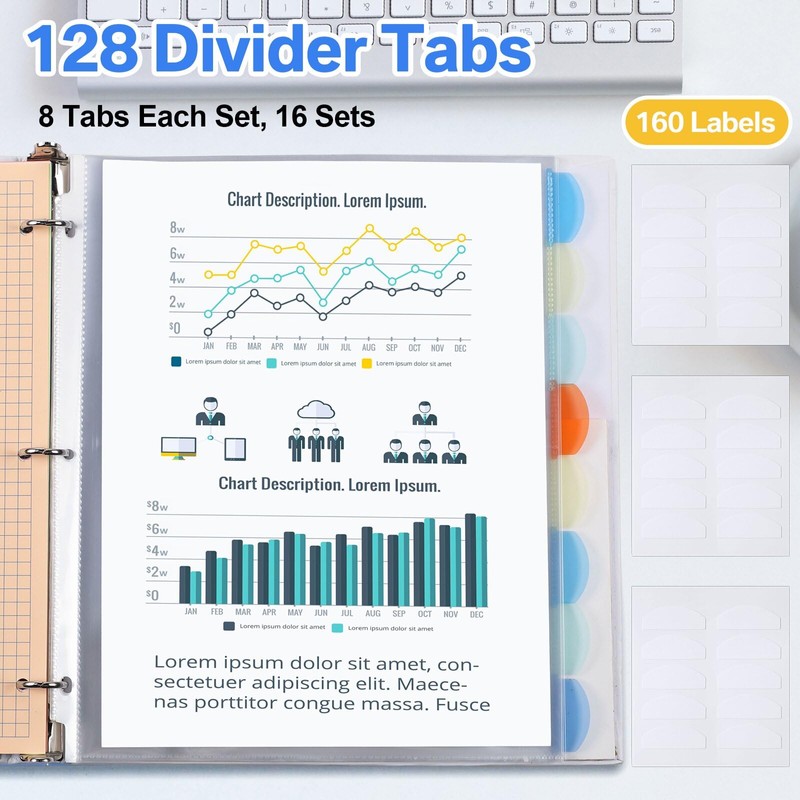 - 8 Tabs: each set of clear sheet protectors for 3 ring binder comes with 8 tabs, so you can easily organize, categorize and locate different sections within your documents easily; A transparent paper protector allows you to view documents clearly
