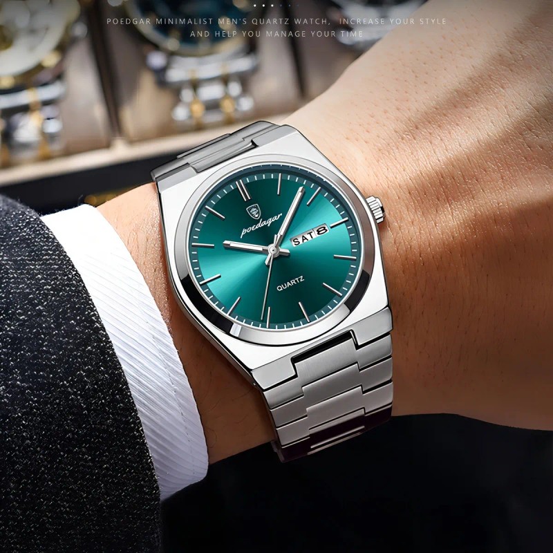 El Poedagar 930 destaca por su diseño elegante y características funcionales. Su caja de metal negro y correa de acero inoxidable ofrecen durabilidad y un aspecto moderno. Equipado con movimiento de cuarzo y funciones de calendario y visualización de día y fecha, este reloj es perfecto para quienes buscan precisión y estilo.