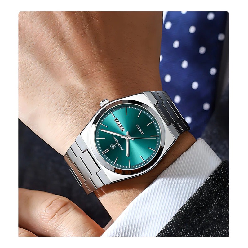 El Poedagar 930 destaca por su diseño elegante y características funcionales. Su caja de metal negro y correa de acero inoxidable ofrecen durabilidad y un aspecto moderno. Equipado con movimiento de cuarzo y funciones de calendario y visualización de día y fecha, este reloj es perfecto para quienes buscan precisión y estilo.