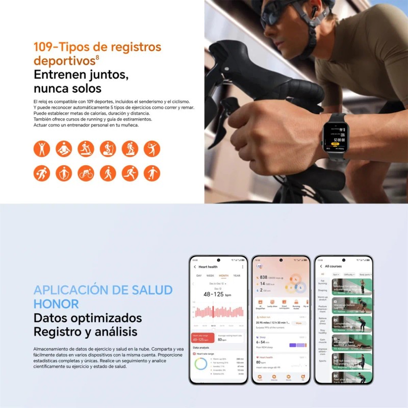 Tu reloj admite 109 modos de entrenamiento, como correr al aire libre, correr en interiores, caminar al aire libre, ciclismo al aire libre, ciclismo en interiores, caminar en interiores, saltar a la comba, elíptica y remo. Puedes ver los datos de tu entrenamiento en tiempo real en el reloj.