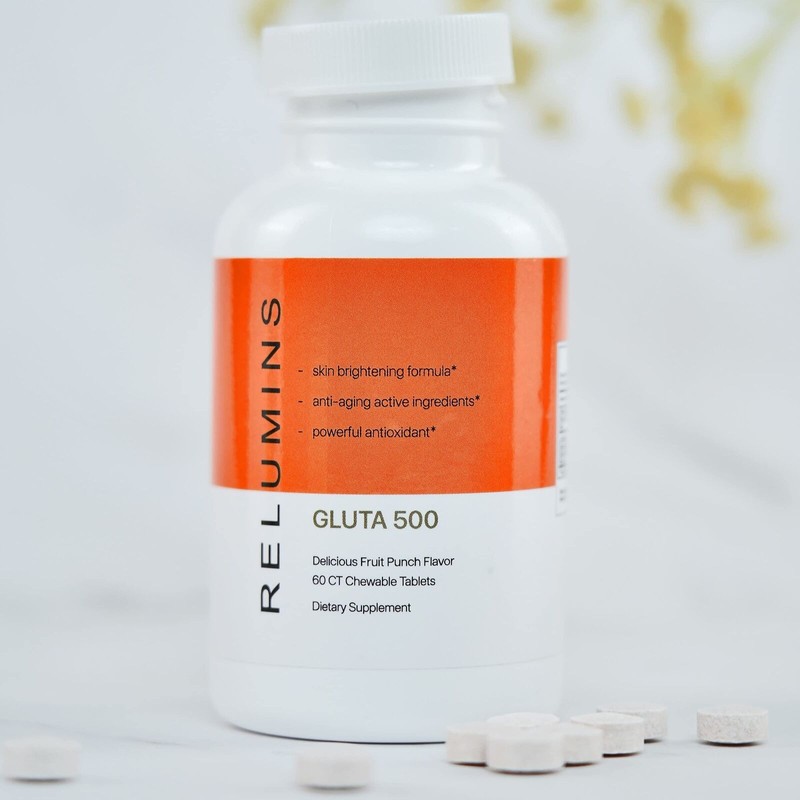Gluta 500 - Look and Feel Your Best Meticulously crafted by the experts at Relumins, Gluta 500 is the first product of its kind. By combining the brightening and antioxidant qualities of glutathione with hyaluronic acid and biotin in an easy, high absorption chewable, Gluta 500 delivers powerful anti-aging compounds to not only your skin, but your whole body, leaving you looking bright and feeling your best.