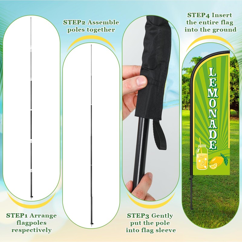 - Robust and Durable Construction: the bars of the lemonade swooper flags are made of metal, which is wind-resistant, high-performance, and high-load-bearing tensile, ensuring stability of the poles and long-lasting durability to withstand varying weather conditions
