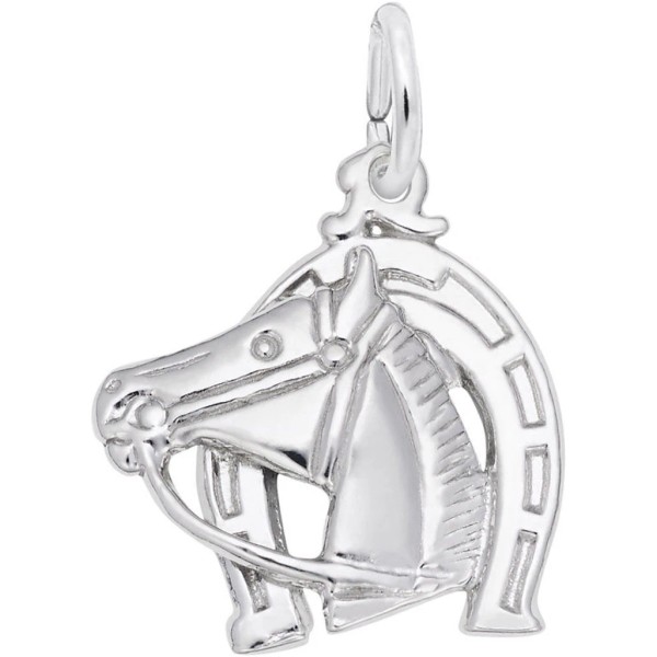 Horse head with horseshoe charm by Rembrandt. Measures approximately 0.55 inches x 0.62 inches (14.09mm x 15.79mm). Genuine rhodium-plated sterling silver.This charm will not fit slide-on bead-style bracelets. HOWEVER, you can add a Rembrandt CharmDrop to make it fit.