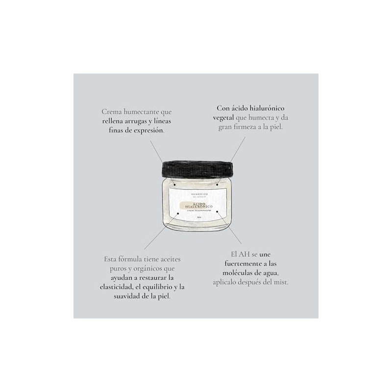 Acerca de este artículo CARACTERÍSTICAS: Crema de ácido hialurónico vegetal que además de hidratar y humectar, da gran firmeza a la piel. El AH BIO se une fuertemente a las moléculas de agua y rellena las líneas finas de expresión, así como las arrugas. USO: Recomendamos su uso en piel seca y piel mixta. En piel seca úsala de día después de aplicar el mist. Si la piel sigue un poco húmeda es mucho mejor. No olvides aplicar después protector solar.En piel mixta úsala sólo de noche y como paso final de tu rutina. Esta crema no está recomendada para pieles grasas y sensibles. BENEFICIOS: Hidrata intensa y profundamente, humecta, ayuda a la regeneración celular, complementa dando firmeza y elasticidad a la piel, previene y corrige arrugas y líneas finas de expresión. El AHBIO es un humectante altamente efectivo: capta la humedad del aire y la lleva a la epidermis, manteniendo la piel brillante, firme y humectada. INGREDIENTES: Esta fórmula tiene aceites puros y orgánicos como el aceite de almendras dulces que ayuda a restaurar la elasticidad y la suavidad de la piel, y la manteca de cacao que aporta ácidos grasos, muy importantes para nutrir la piel. REMEDIOS DEL BOSQUE: especializada en productos para el cuidado personal de toda la familia, creados a base de herbolaria. Nuestra filosofía es fomentar el cuidado natural de la piel y el cuerpo. Creemos que la salud y la belleza van de la mano, y que, cuando la piel está en balance, irradia un brillo natural que ningún maquillaje puede replicar.