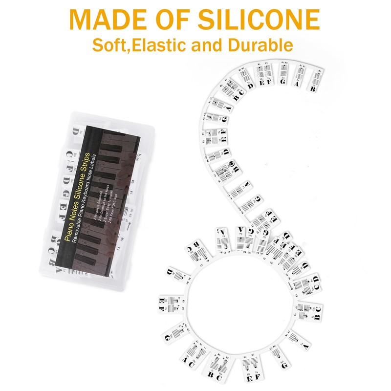 - Beginner-Friendly-It comes with a reference for key location and helps associate the piano keys with the musical score. You just need to put the note strips on the piano keyboard according to the serial number printed at the upper left corner of each silicone stripe. It's done in seconds! Moreover, its highly soft silicone texture won’t bother your fingers while playing. Whether you fold or curl them, they will fit perfectly on your keyboard when you take them out for use.