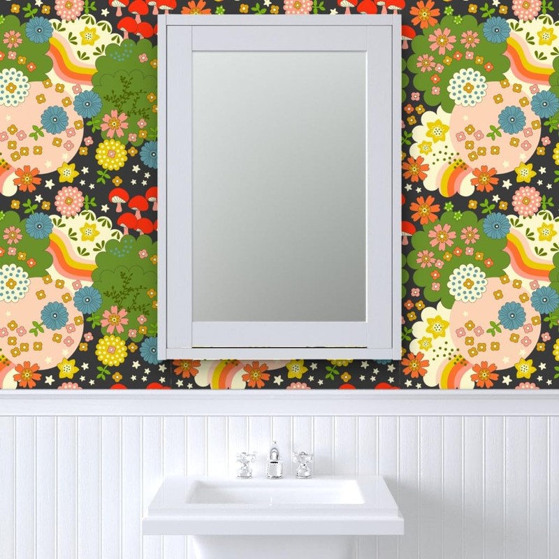 Removable Wallpaper Swatch - Cosmic Flowering Retro Flowers Vintage Psychedelic Groovy Hippie Mushrooms Stars Rainbows Garden Custom Pre-Pasted Wallpaper by Spoonflower